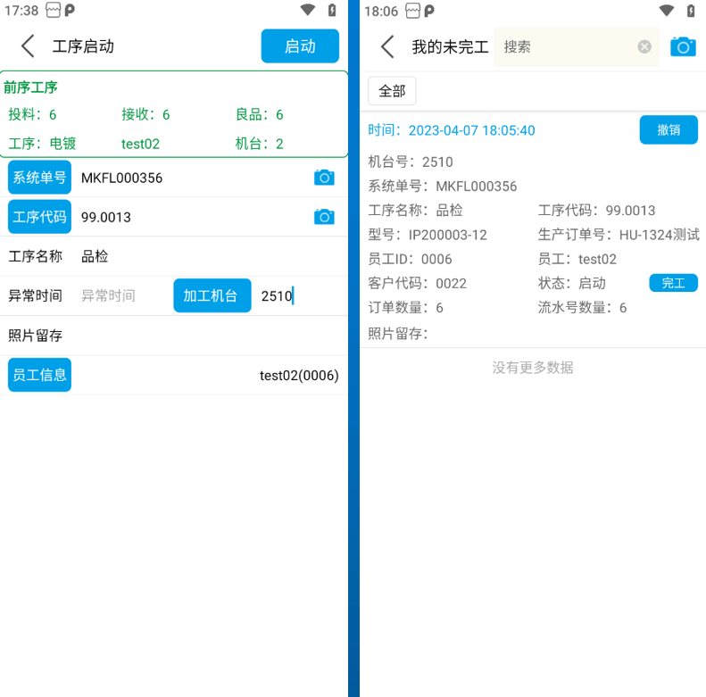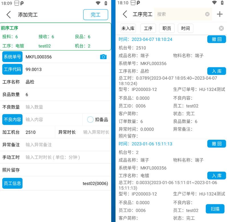 由被派工职员操作,打开工序扫码过程表,选择自己的职员信息,切换至启动选项,如确认无误,点击完工,并填写良品数量,工废数量(不良品数量,如果没有请填写0),料废数量(不良品他责数量,如果没有请填写0)点击确定即可。