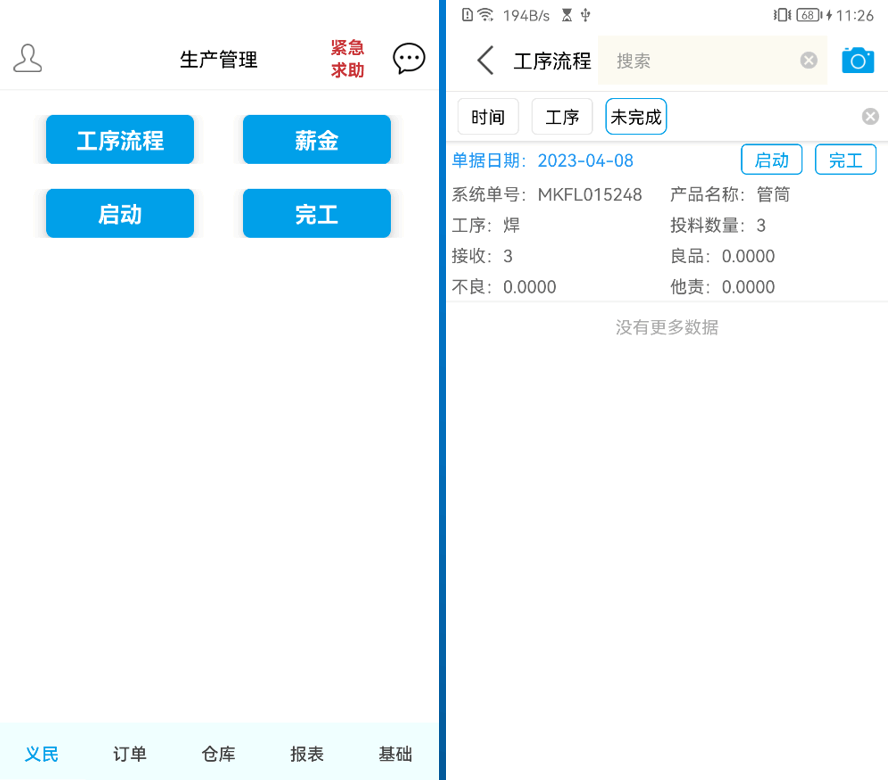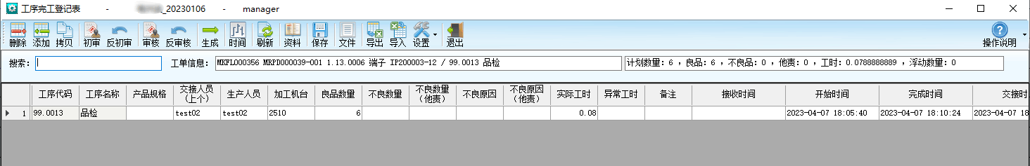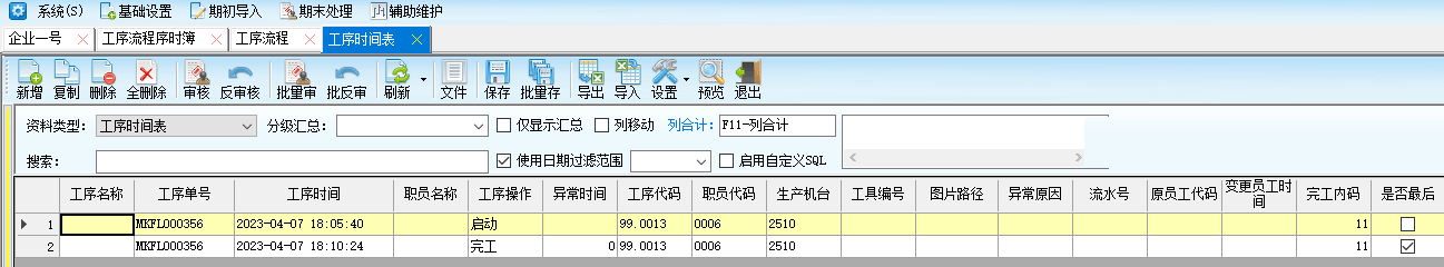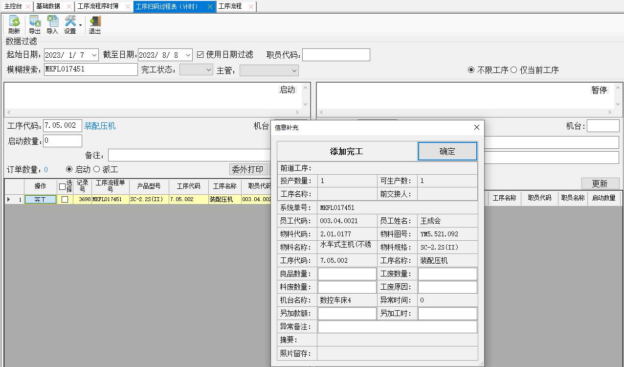 打开工序完工明细表,选择完工的单据信息,即可查看对应的完工信息,包括启动时间,完工时间,实际工时以及未完工数量等其他相关信息。