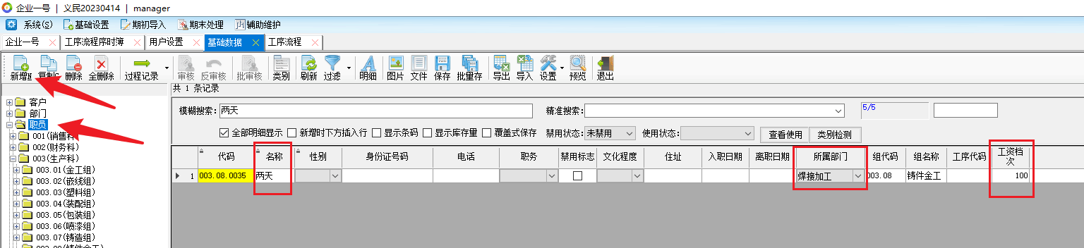 基础数据 选择职员资料 点击新增 输入职员名称 / 所属部门 / 工资档次 ( 必填,其他选填 )
