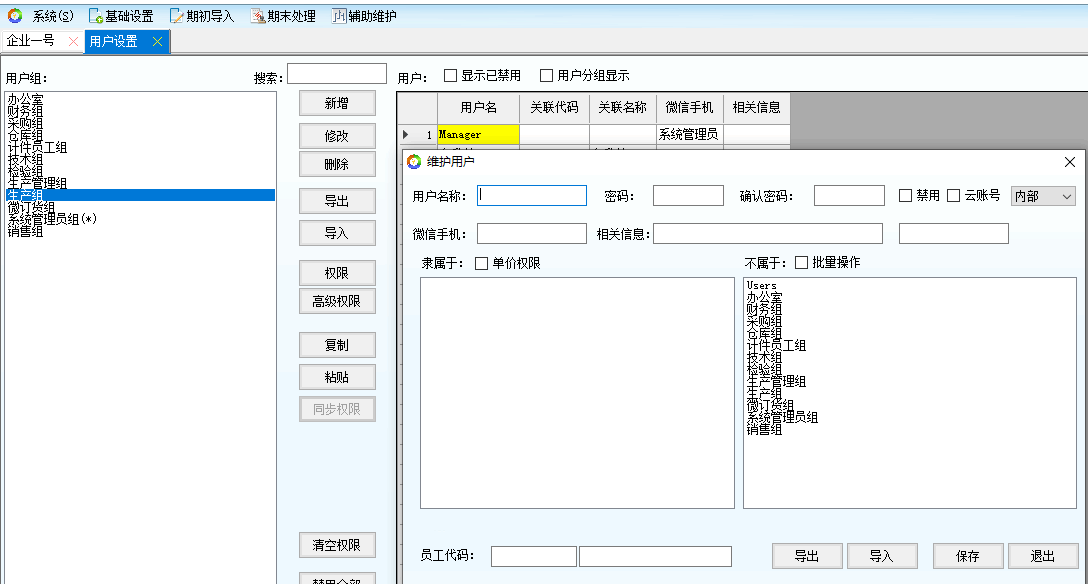 基础设置 > 用户设置 > 新增用户 设置用户名, 登陆密码, 用户组, 关联员工代码 ( 职员如若具备登陆属性, 则用户名与职员姓名应保持一致 )